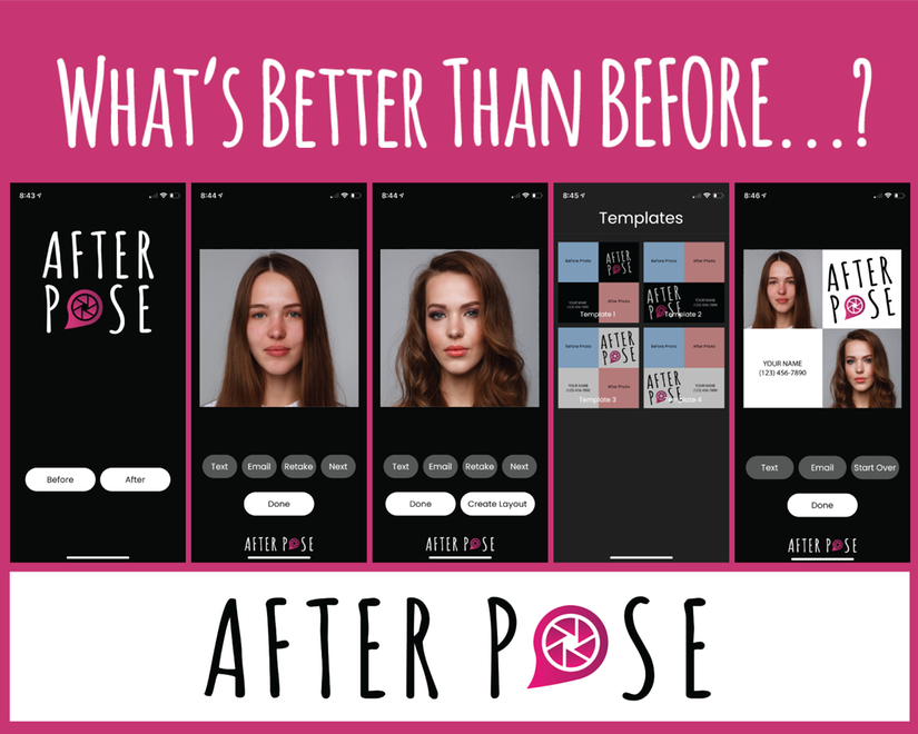 Capture your clients Before & After photos and quickly share branded images with them on the spot through text and email. Make before and after comparisons without the endless scrolling back in time though your camera roll. These custom branded photos also automatically save to our online platform for management with quick and easy social media connections to your business Facebook, Twitter & Instagram accounts. No more hoping clients or your staff post and/or tag you showing their results – now the power is in your hands.