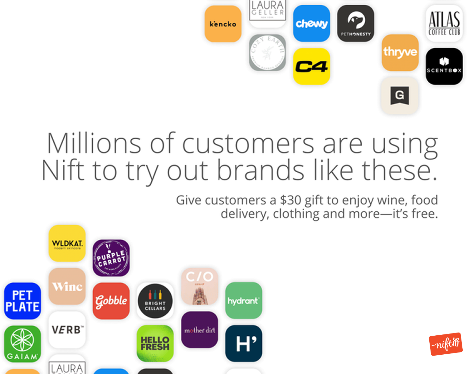 Businesses like Gaiam and Hello Fresh, trust Nift’s matchmaking technology to bring them the right new customers—people who are more likely to return. That’s why they cover the full cost of Nift gift cards.