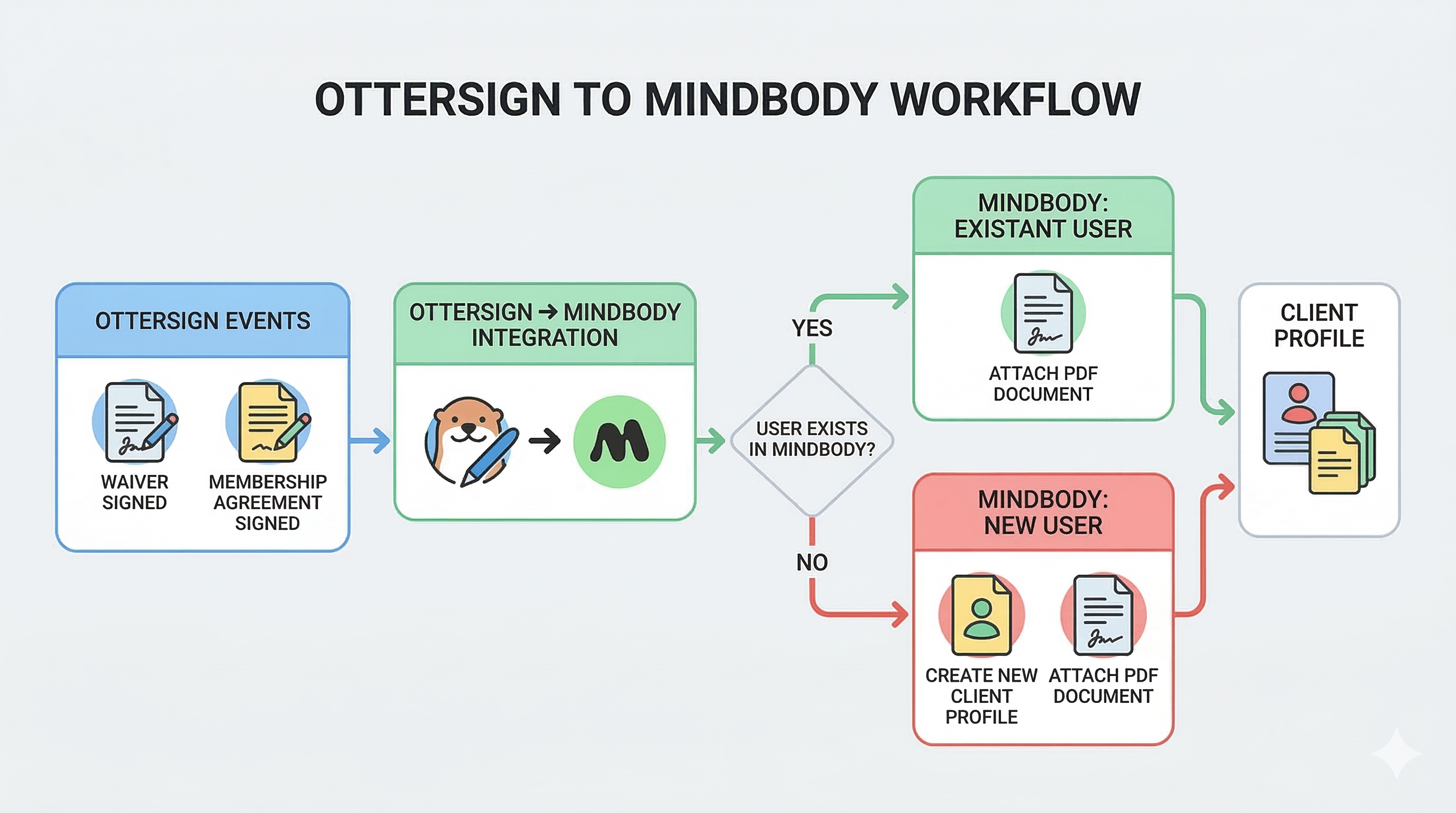 OtterSign connects directly to MindBody with no manual data entry required. Every signed document is automatically linked to the corresponding client record in real time — names, emails, phone numbers, and addresses sync bidirectionally so your MindBody profiles stay complete and current without any staff intervention.