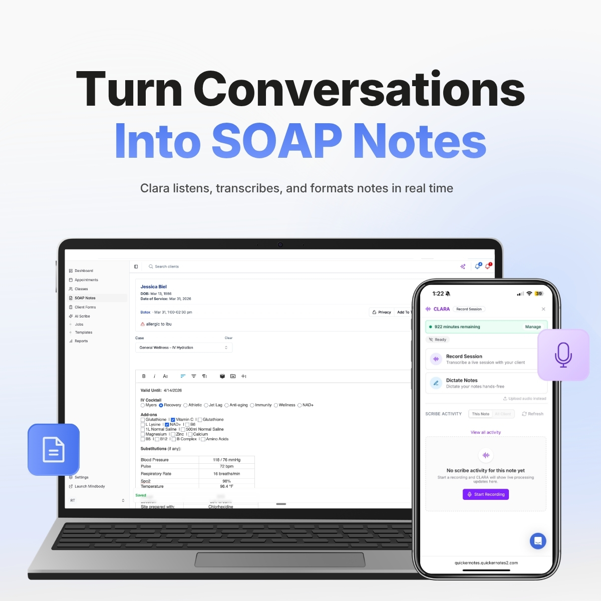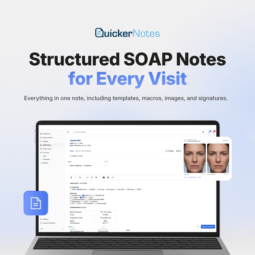 QuickerNotes is the go-to SOAP note solution for Mindbody and Booker practices that need clinical documentation: