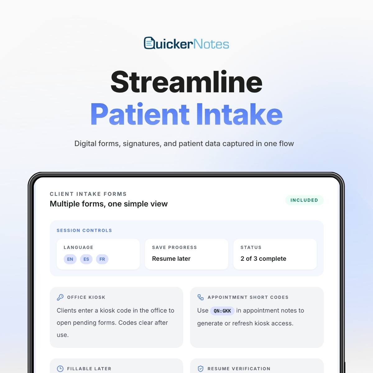 Send secure client intake forms before the visit based on send rules. Clients save progress in their language, capture signatures and policy acceptance, then submitted data syncs back into the same chart on your platform. Supports English, Spanish, and French. Included in the core subscription — no separate transaction fees.