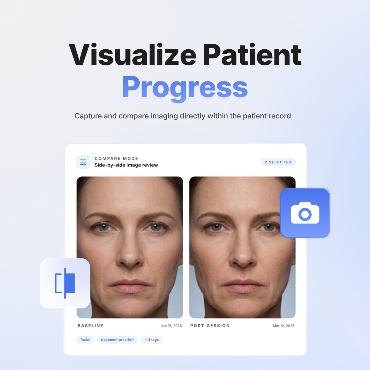 ✅ Clinical imaging with before & after tracking — upload full-resolution photos, tag them with custom labels, and compare side-by-side over time. All stored in HIPAA-compliant cloud. (Paid add-on.)