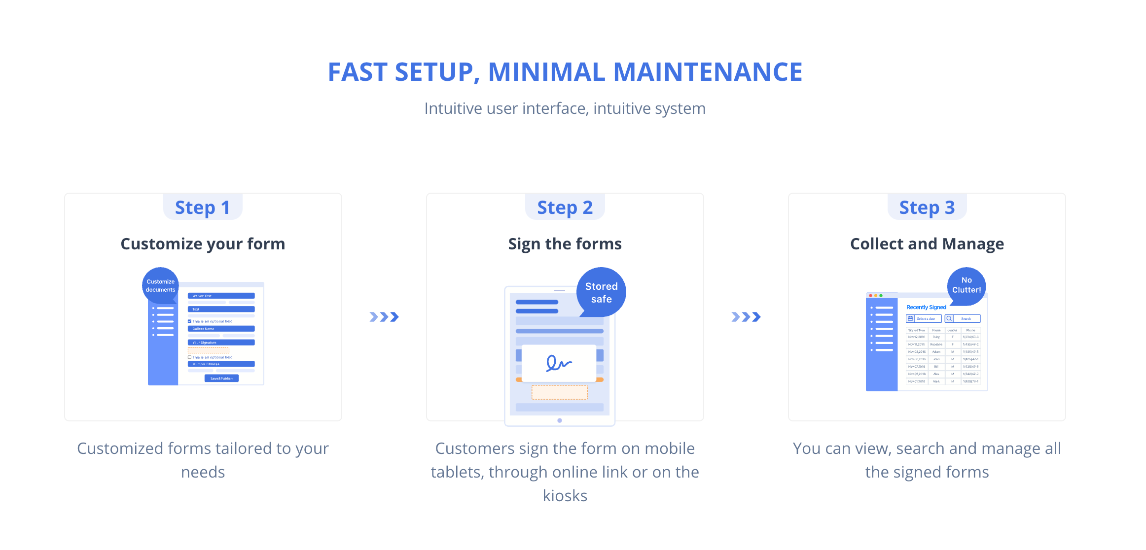 You can collect your waivers through all kinds of business scenarios. Except for online sign, we provide free App to support Kiosk and mobile sign.
