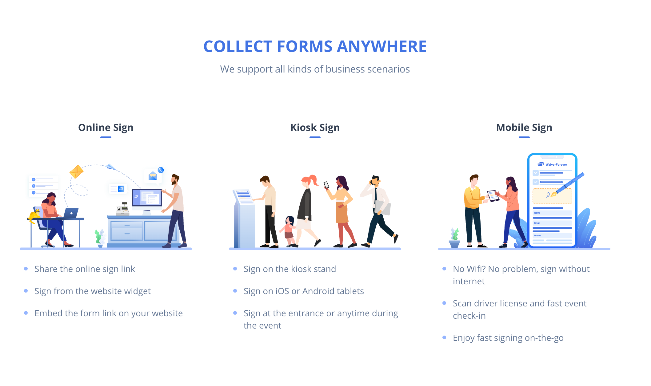 You can collect your waivers through all kinds of business scenarios. Except for online sign, we provide free App to support Kiosk and mobile sign.