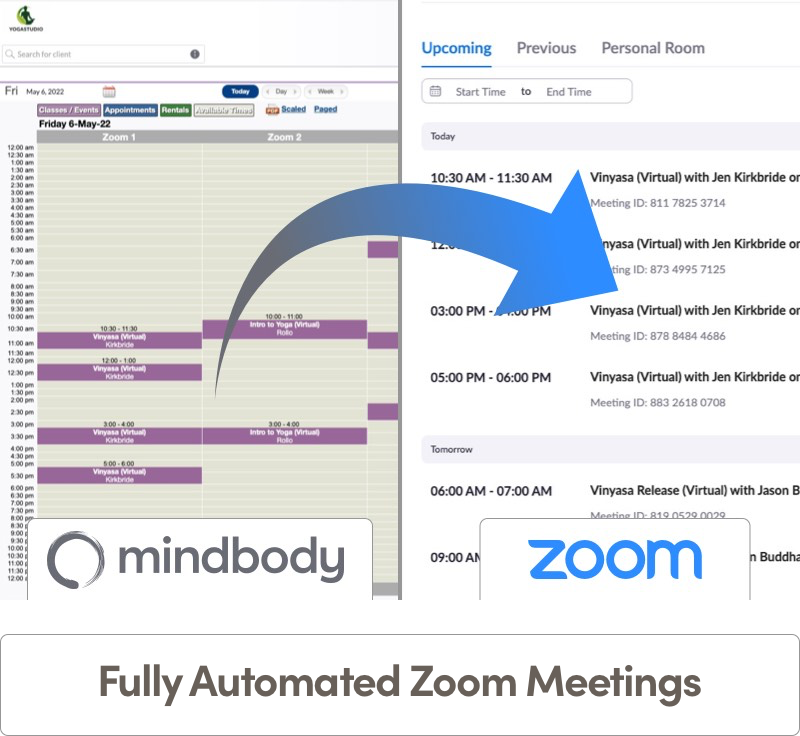 • Zoom meetings will be created and modified automatically to match your Mindbody schedule. Set it and forget it! Supports classes, enrollments and appointments.